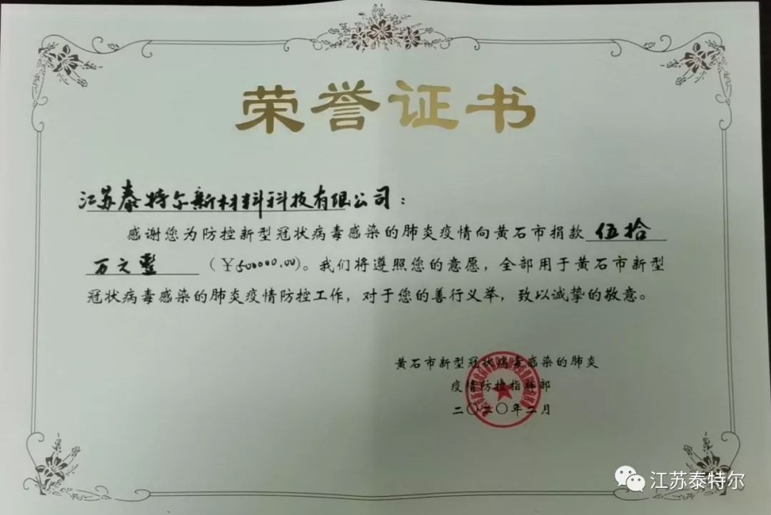 新型冠狀病毒肺炎爆發,以武漢為中心迅速向周邊蔓延,目前疫情已蔓延至全國各省,面對這場突如其來的疫情,江蘇泰特爾新材料科技有限公司緊急決定向黃石市慈善總會捐贈人民幣50萬元,為防控疫情貢獻應有之力。